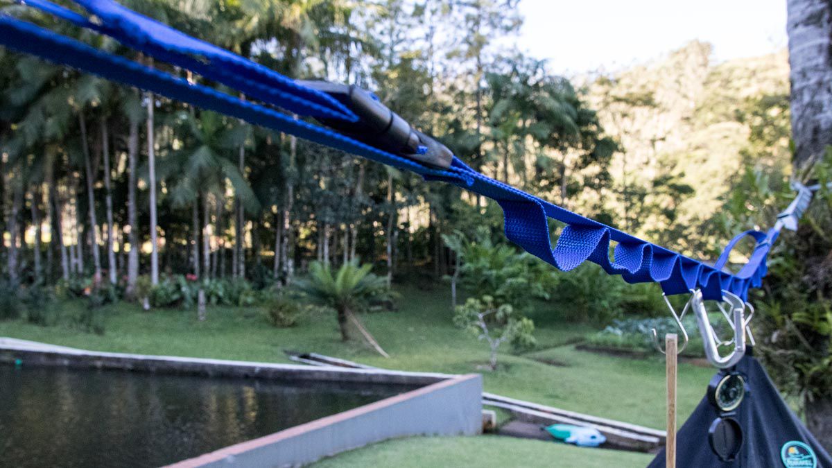 Com extensão máxima de 1,80m e podendo ser regulado até se compactar ao tamanho desejado por conta de dois reguladores de poliacetal acoplados ao mesmo, o Varal pode vir a ser uma ferramenta muito útil em seus acampamentos e aventuras